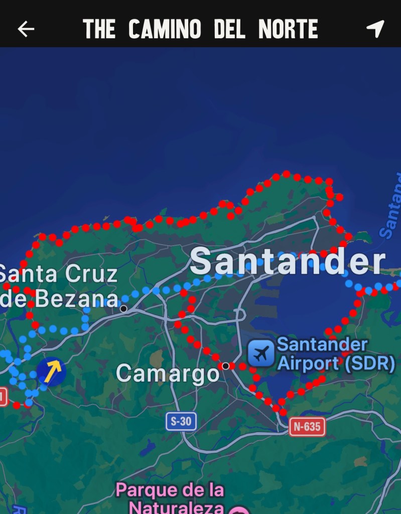 Today was the first day of actual walking on this stage. As usual, a certain amount of reorganization takes place to try and make what I actually carry as light as possible. And, as usual, I am unsuccessful and end up carrying around 20 lbs in spite of having a suitcase transported. Walking out of big cities is never that great and today was pretty much solid pavement walking all day. First hour or so was just getting out of Santander, and glad I had an app to guide me as there was not much waymarking. Once out more in the countryside, still not great as often busy roads with no sidewalk etc. Did end up at nice roadside restaurant for lunch about half hour short of final destination, menu del Dia for 13 euros including wine! After lunch it turned out that the direct route to the hotel involved a substantial hill climb but fortunately of limited duration. Lovely old Palace type place, Palacio de Arce hotel, seems like a family enterprise with pleasant but sparse rooms and what appears to be a very active white table cloth restaurant. It’s now 4:30pm and people are still finishing lunch. Dinner is not served until 8:30pm at the earliest. As usual on the first day, a certain amount of soreness sets in, nothing can really train you for 4-5 hours of walking per day with heavy pack other than just doing it. Since this is something like my 10th trip like this, I am used to the idea that I will be sore for the first 3-4 days and then you get the second wind. 23,000 steps.