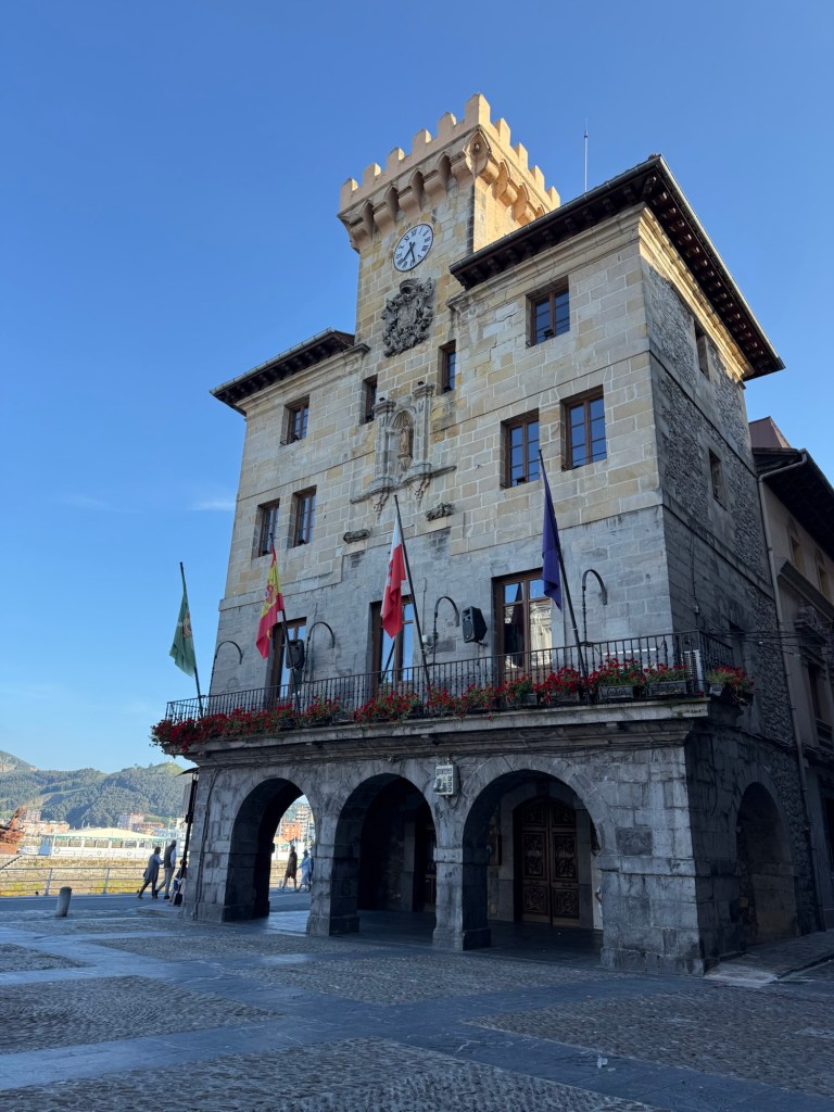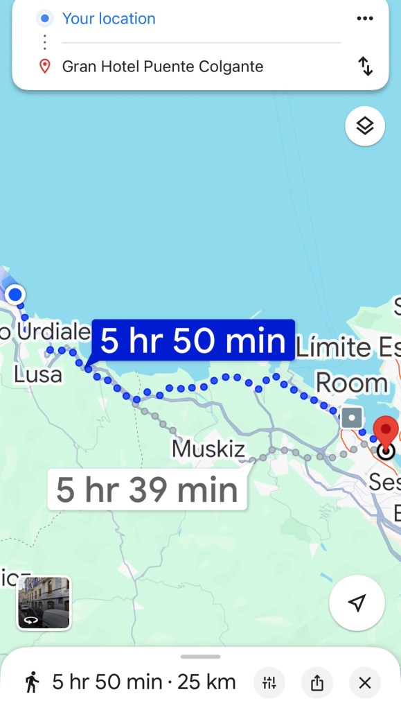 Early start today as you are supposed to have your luggage downstairs by 8:00am for pickup. (Of course it wasn’t picked up till well after 11:00am). A four hour walk along the river, past the Guggenheim to Portugalete. All paved, so even though not a long day a little tough on the feet. Portugalete is an interesting place. First, go here by crossing the river on a carrier bridge, I have never seen this before and it might be the only one in the world. Basically a platform that carrys cars and people, suspended from wires, see photos. Then, the town is on a hillside sufficiently steep that it has moving sidewalks to take you up the hills. Very cool. I’m in an old school 4* hotel so no complaints there. The town has a great energy with lots of sidewalk tables and bars, tons of parents with children, a great waterfront promenade. In the smaller town category of places I have visited in Spain this would be tops with Gernika close by. In the bigger towns. San Sebastián and Sevilla get the nod, although Bilbao has substantially grown on me from an initial negative to now I quite like it. 27,291 steps.